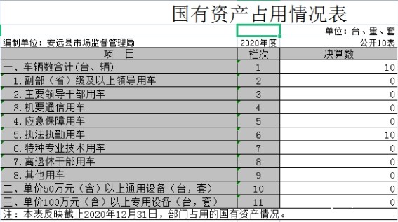 截止2020年12月31日,本部门(单位)国有资产占用情况见公开10表《国有资产占用情况表》。本部门共有车辆10辆。 其中,执法执勤用车8辆 ,一般公务用车2辆, 其他用车0辆。