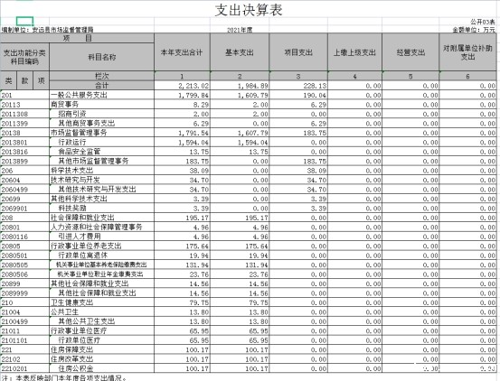 本部门2021年度支出总计2213.02万元,其中本年支出合计2213.02万元,较2020年增加327.02万元,增长14.77%,主要原因是:1、市场监管任务繁重争取到县财政食品监管、企业发明专利奖资金支持,2、三无县奖励、棚户区改造项目土地房屋征收工作增发工资、招才引智优惠政策研究生奖励。年末结转和结余0万元,较2020年增加(减少)0万元,增长0%。