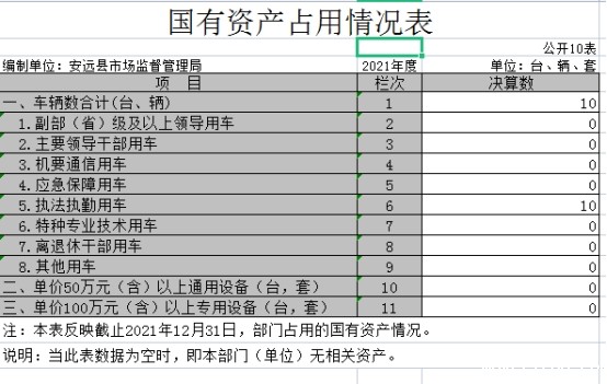 截止2021年12月31日,本部门(单位)国有资产占用情况见公开10表《国有资产占用情况表》。本部门共有车辆10辆。其中,执法执勤用车8辆,一般公务用车2辆,其他用车0辆。