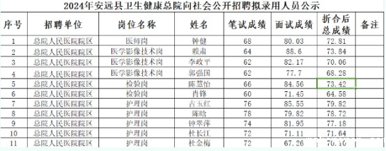 安远县卫生健康总院公开招聘卫生专业技术人员相关招聘工作已结束,经笔试、面试、体检等程序,确定钟健等11人为安远县卫生健康总院人民医院院区拟录用人员(具体名单见附件),现予以公示。