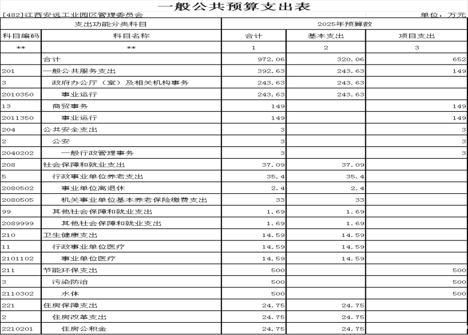 2025年江西安远工业园区管理委员会财政拨款支出预算总额为972.06万元,较上年预算安排减少21.95万元。