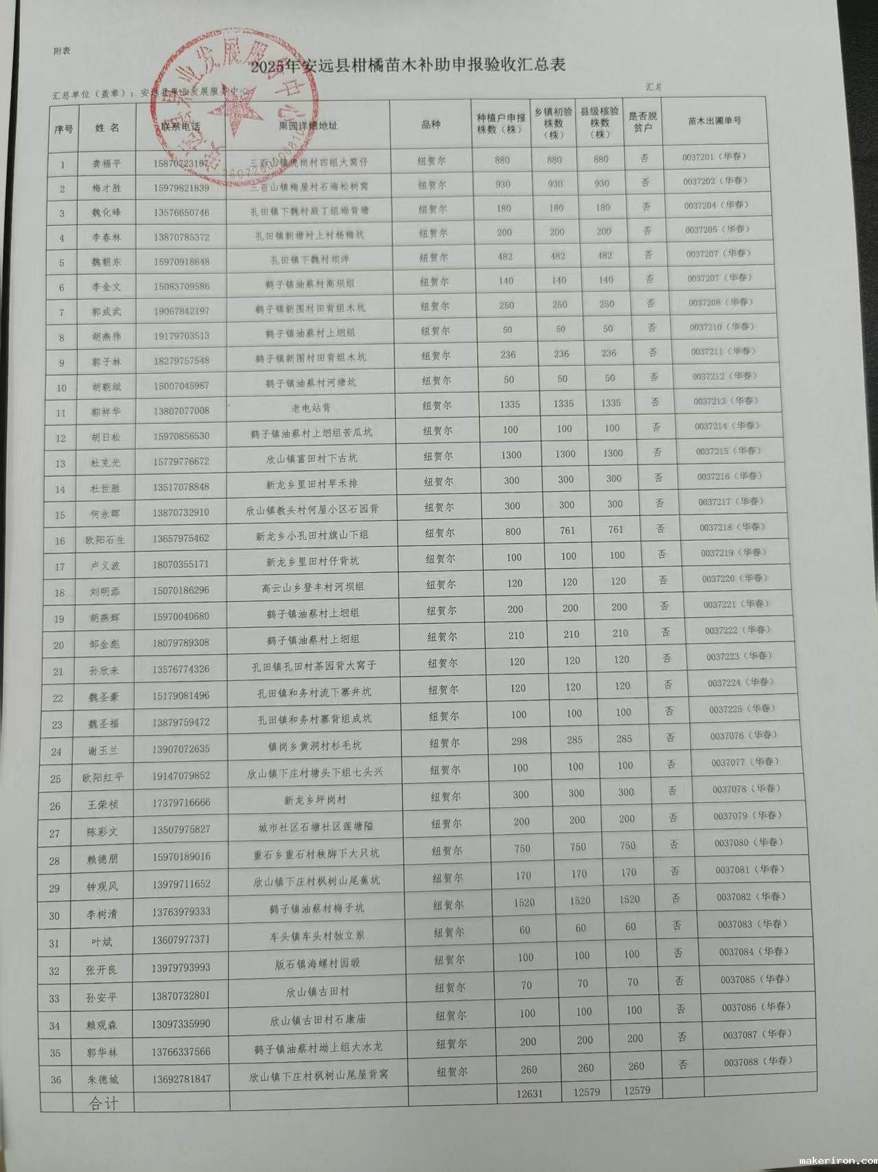 根据《安远县2025年柑橘黄龙病防控工作方案》(安府办字2025〕19号)文件精神,经种植户申报、各乡(镇)初验,我中心对2025年1-9月份柑橘苗木进行逐户核验,共验收柑橘苗木拟补助36户、12579株(详见附表)。