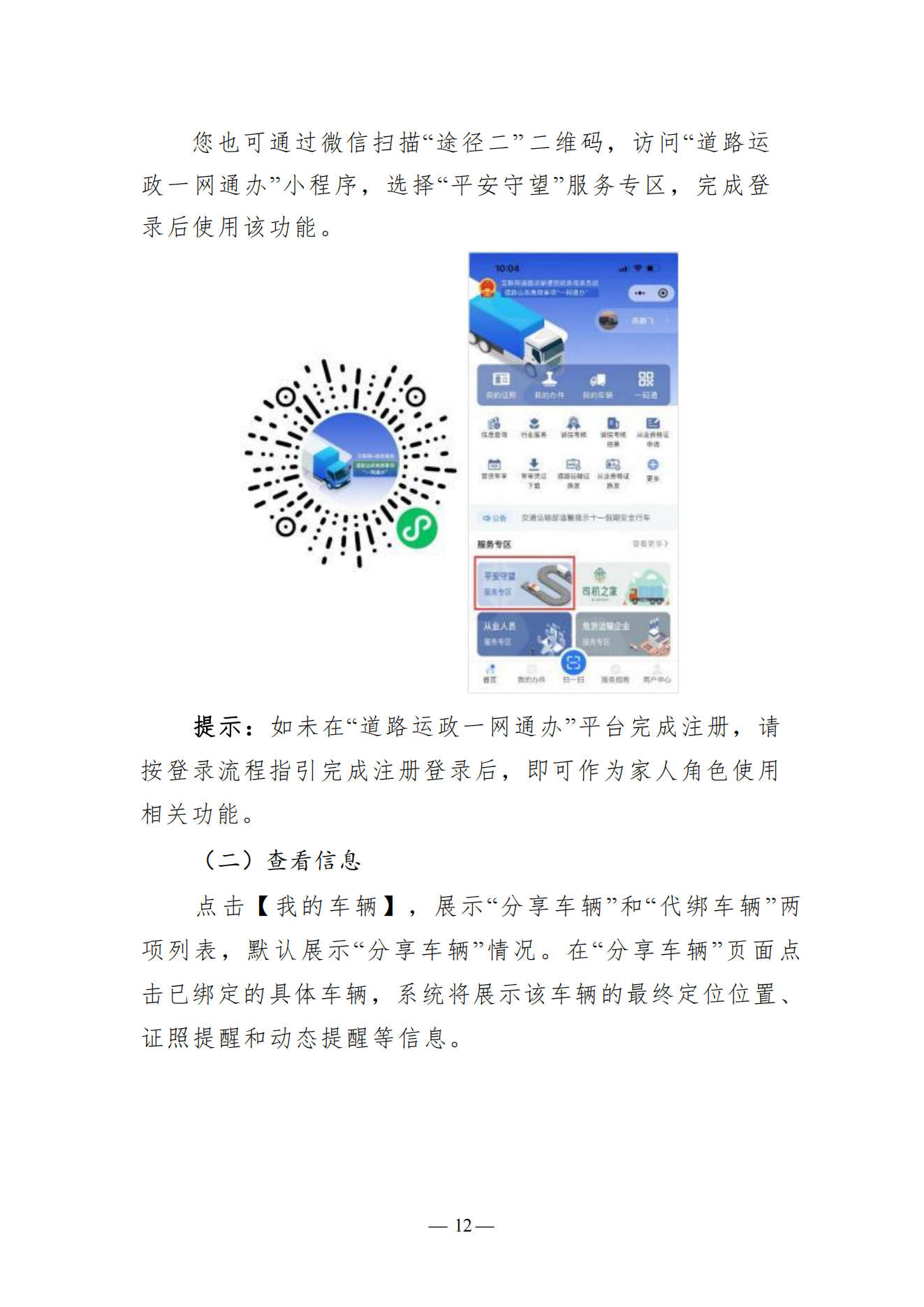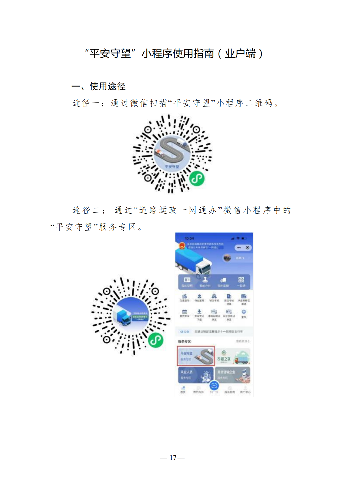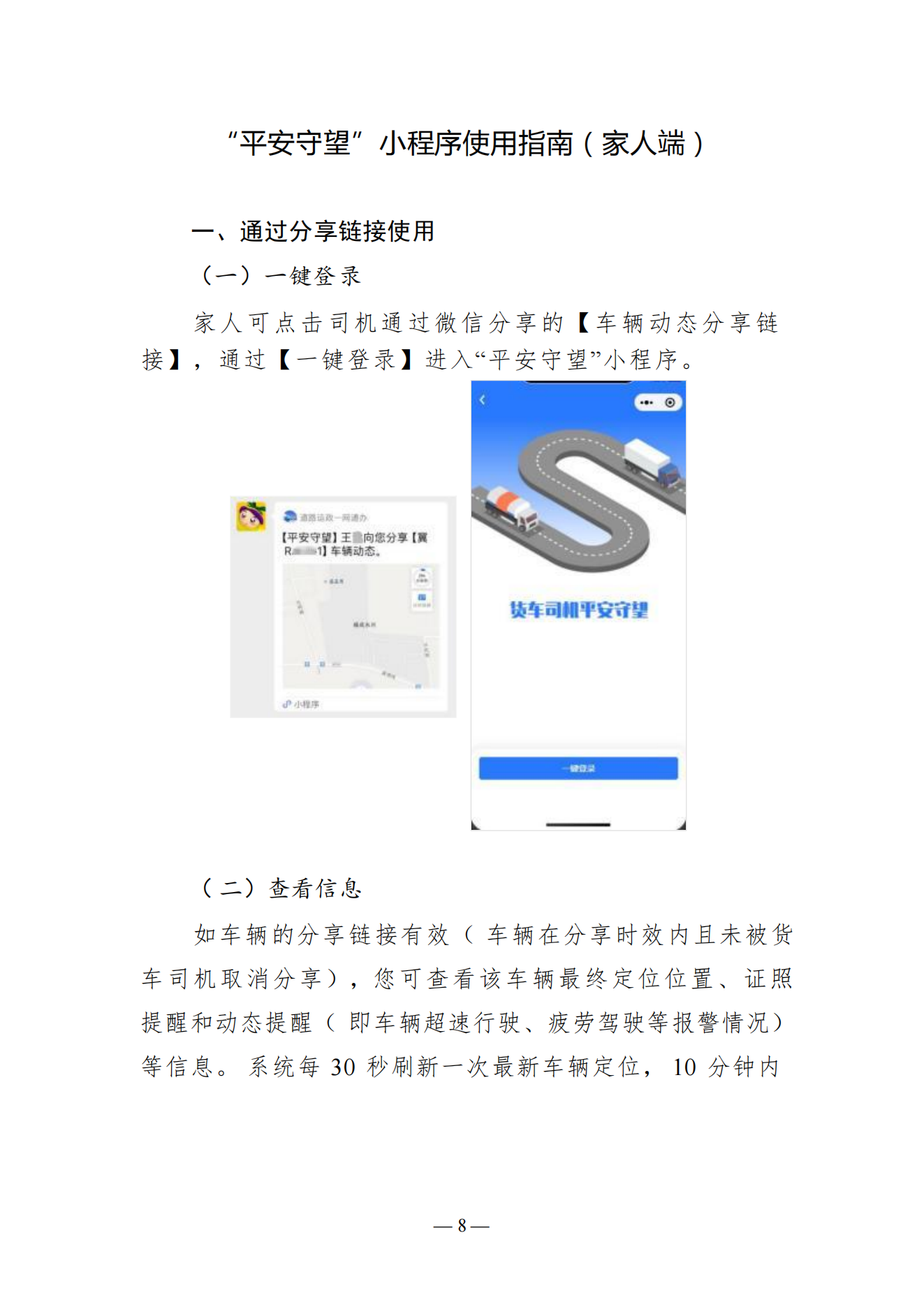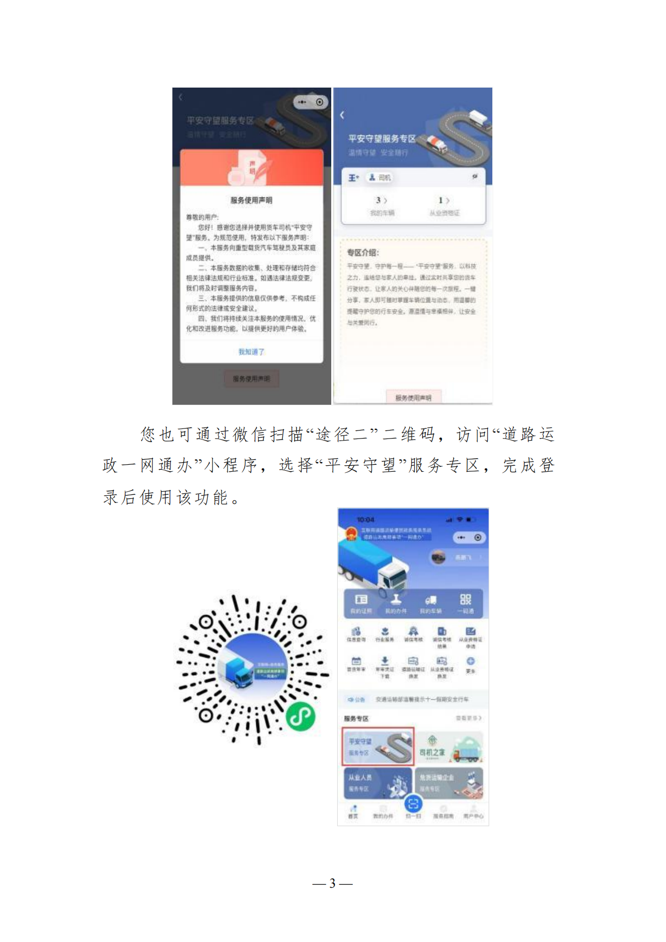 为深入贯彻落实“人民至上、生命至上”要求,坚守“人民交通为人民”初心,交通运输部组织开发了重型普货司机“平安守望”小程序,现已正式上线运行。