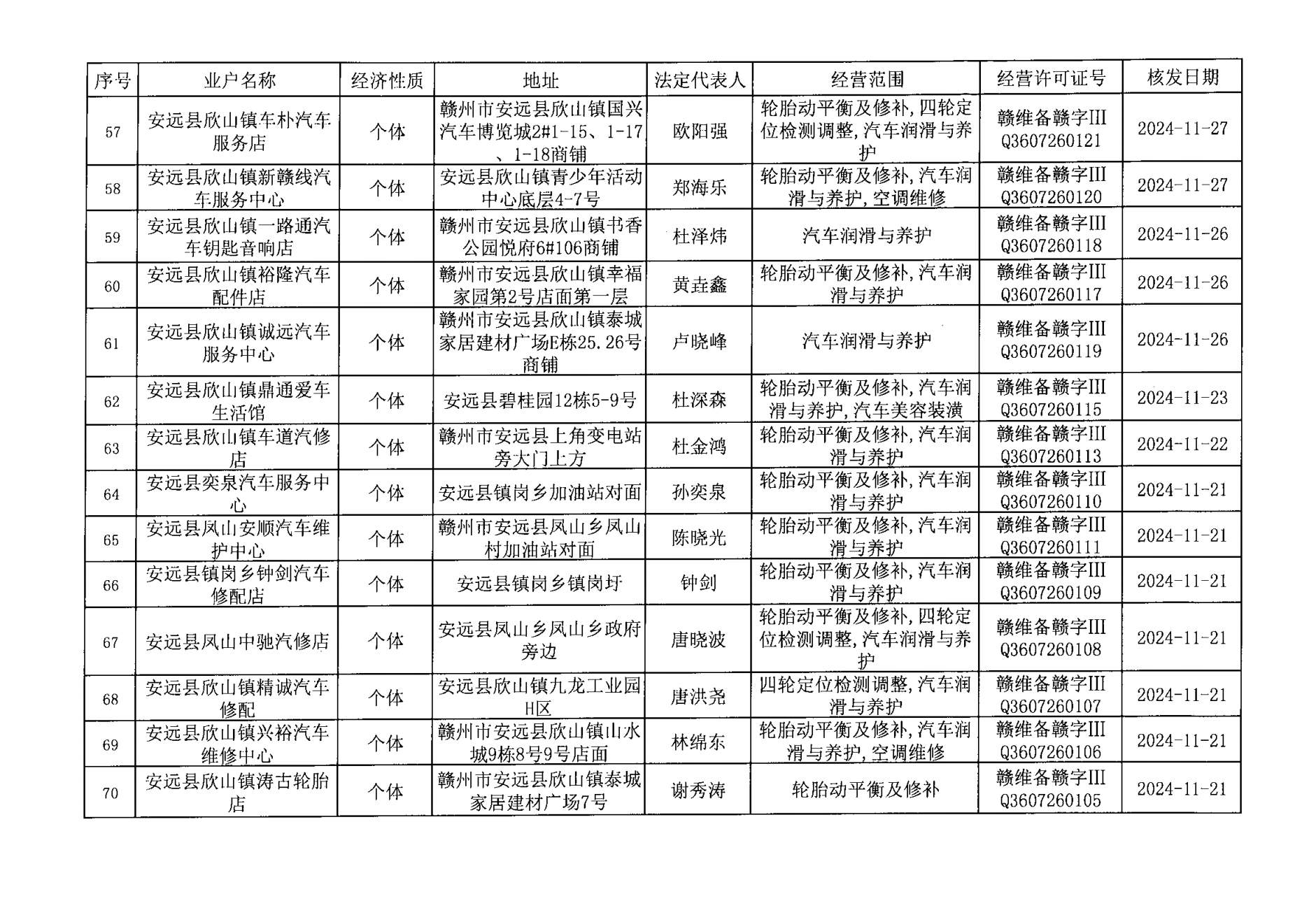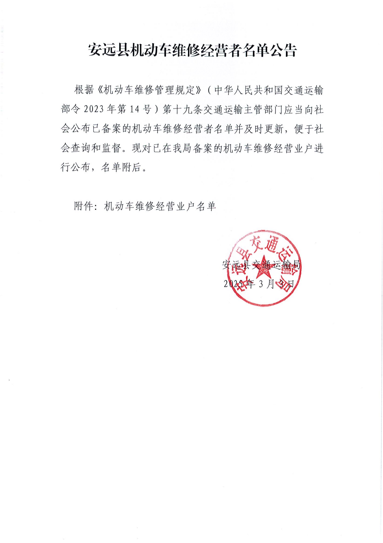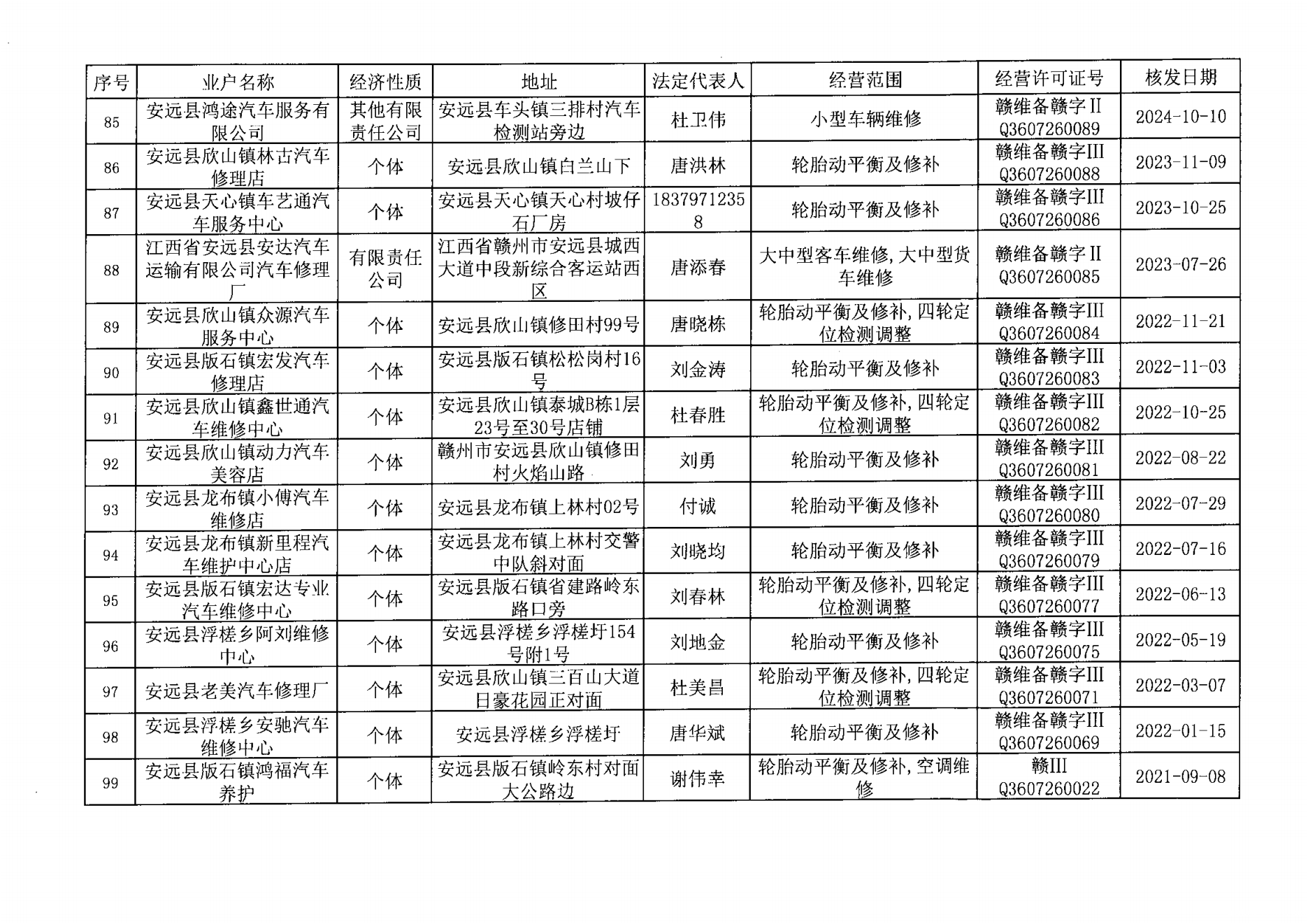 安远县机动车维修经营者名单公告
