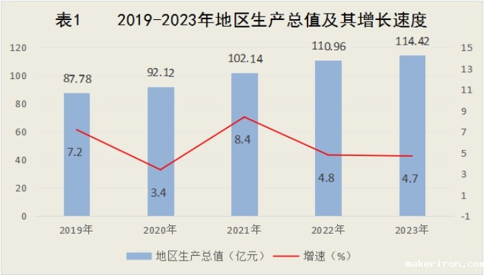 全年实现地区生产总值(GDP)114.42亿元,按可比价格计算,比上年增长4.7%,增幅比上年回落0.1个百分点。分产业看,第一产业增加值24.01亿元,增长5.8%;第二产业增加值32.59亿元,增长10.5%,其中工业增加值增长10.1%;第三产业增加值57.82亿元,增长1.3%。三次产业结构由上年的21.2:27.1:51.7调整为21.0:28.5:50.5。非公有制经济增加值66.55亿元,增长5.0%。