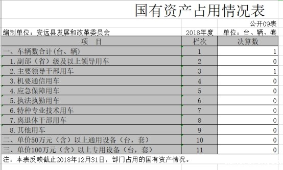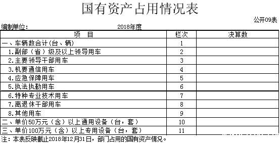 截止2018年12月31日,本部门共有车辆 1辆,其他用车 1辆,其他用车主要是其中,副部(省)级及以上领导用车 辆、主要领导干部用车 1辆公务用车、机要通信用车 辆、应急保障用车 辆、执法执勤用车 辆、特种专业技术用车 辆、其他用车 辆,其他用车主要是……;单位价值50万元以上通用设备 台(套);单位价值100万元以上专用设备 台(套)。