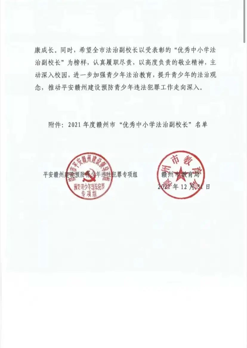 日前,赣州市平安赣州建设领导小组预防青少年发展犯罪专项组与赣州市教育局联合开展了2021年度赣州市“优秀法治副校长”评选表彰活动,经过评选,我县车头司法所孙科等7名法治副校长获得2021年度赣州市“优秀中小学法治副校长”称号。
