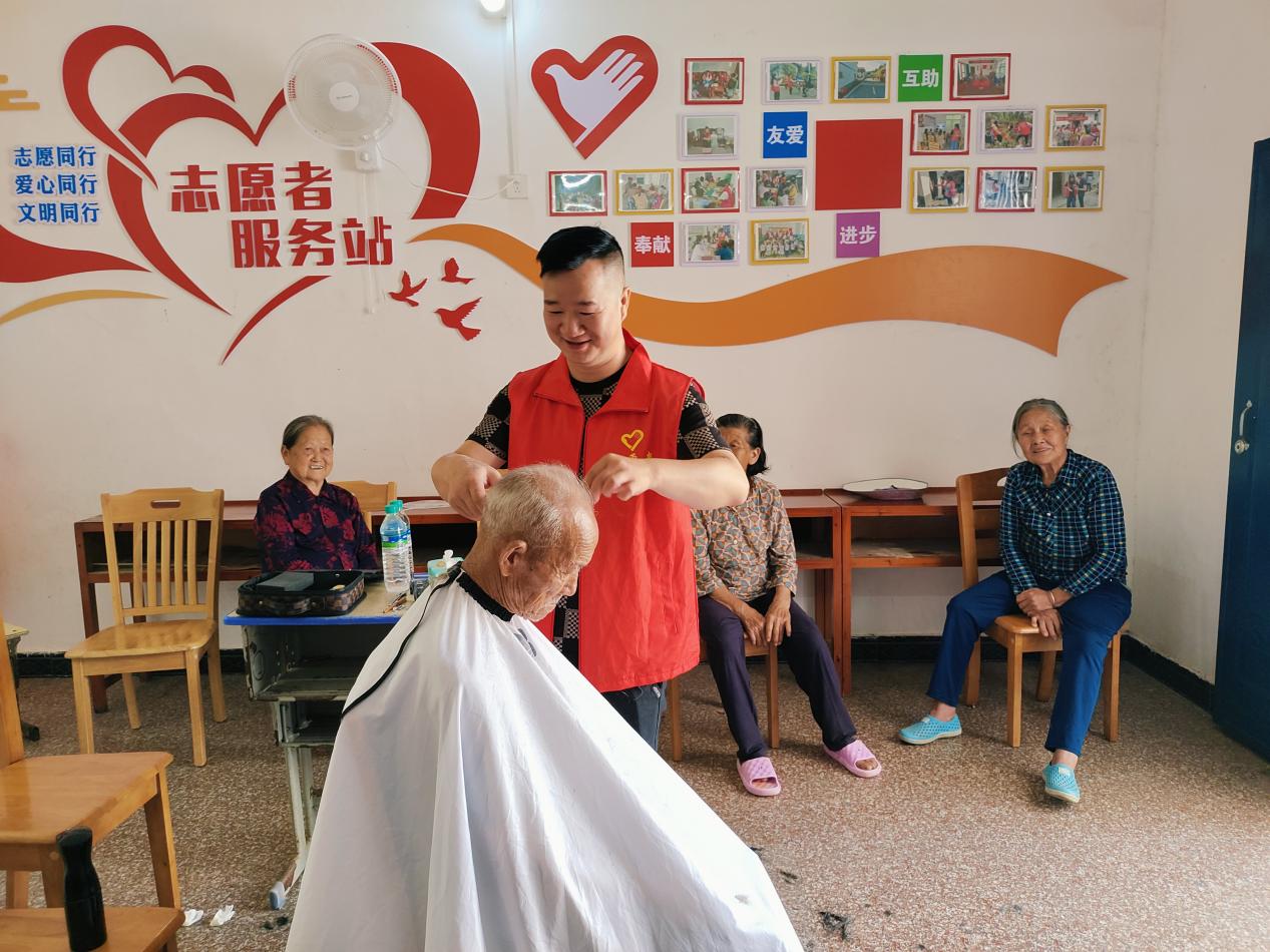 理发店专业理发师化身文明实践志愿者,为辖区内留守老人、留守儿童提供免费理发服务。