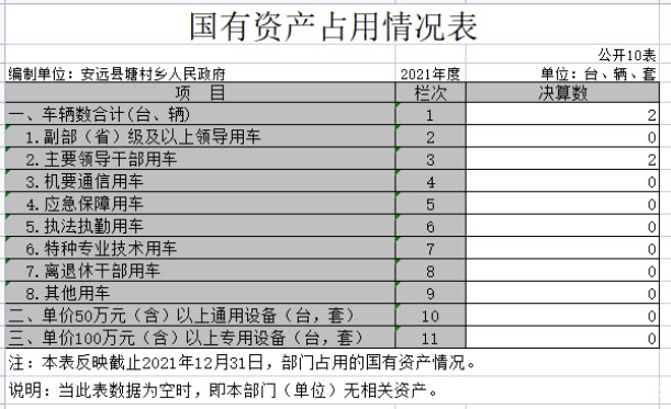 截止2021年12月31日,本单位国有资产占用情况见公开10表《国有资产占用情况表》。其中车辆中的其他用车主要是乡镇主要领导干部用车。