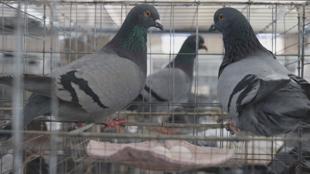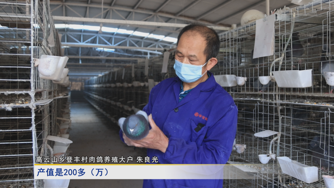 采访 高云山乡登丰村肉鸽养殖大户 朱良光:规模现在是养了6500对,场地占地是2000平方(米),一年下来出栏量大约是10万(只),产值是200多(万),鸽子的品种有瓦灰鸽、银王。
