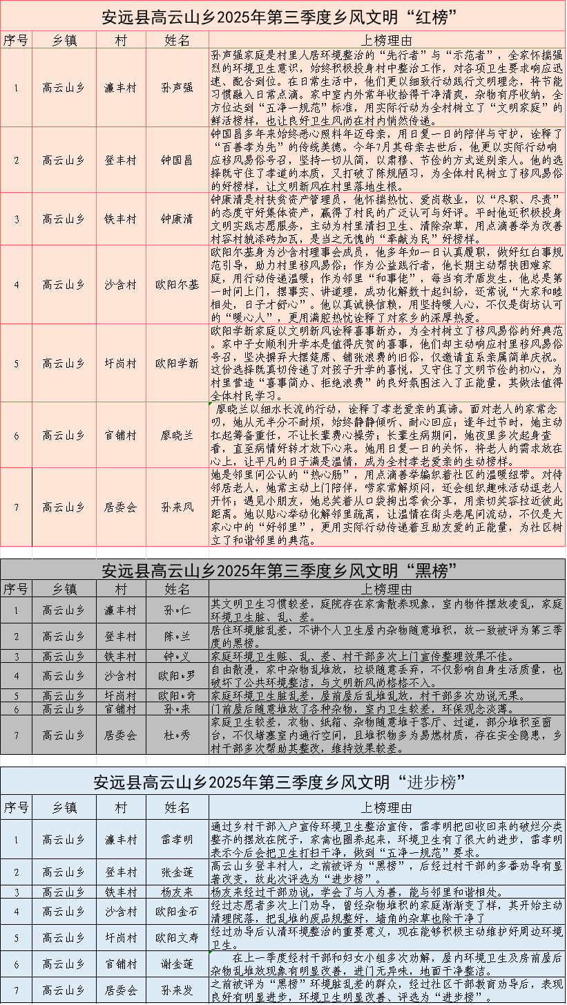 现将高云山乡2025年第三季度乡风文明“红黑榜”“进步榜”公布如下: