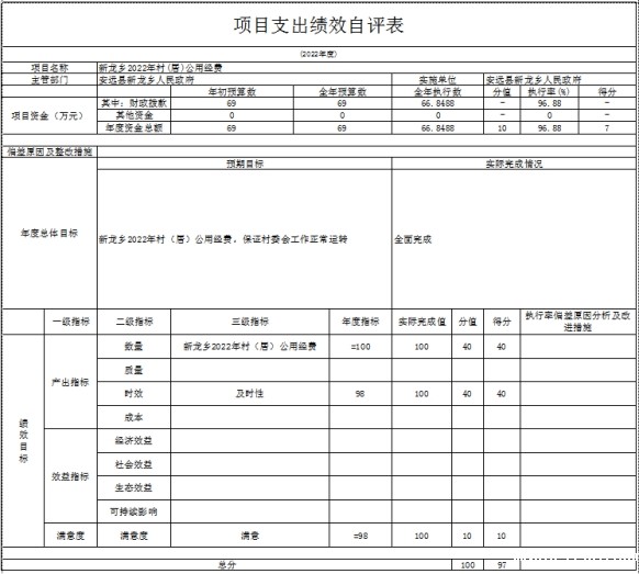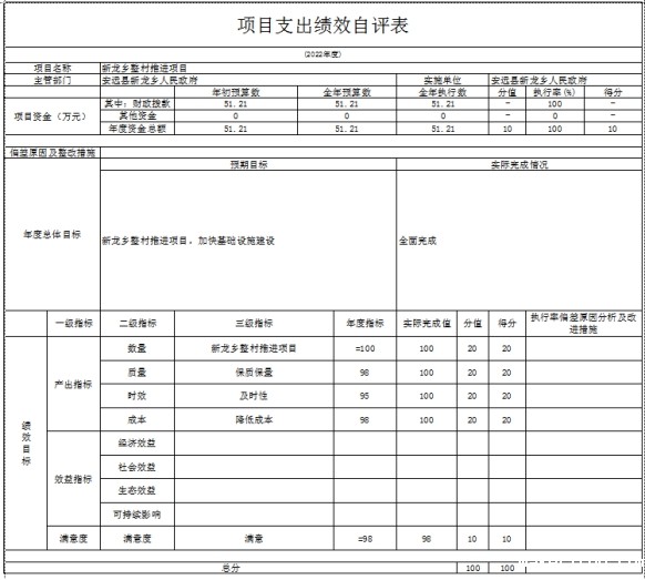 新龙乡严格按照2022年预算编制通知和有关要求,按时完成了单位在编人员信息和编制了单位预算;按项目绩效评价要求对2022年部门整体支出开展绩效自评,报送了人居环境长效管护3.01万元、农业水价综合改革精准补贴资金6.99万元、高标准农田建设经费18.15万元;整村推进项目51.21万元;村居公用经费69万元、疫情防控工作经费3万元等6个项目。从评价情况来看总体看,我单位预算编制及执行决算较为准确,支出管理较为规范,财务管理制度较完善,部门整体绩效较好,填报的绩效目标完整、可行。