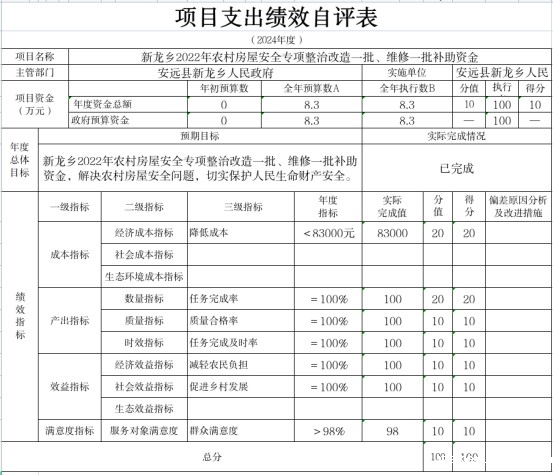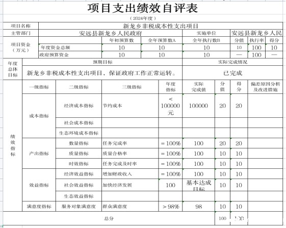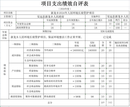 安远县新龙乡人民政府(本级)项目支出绩效自评结果如下: