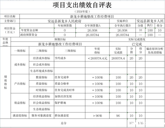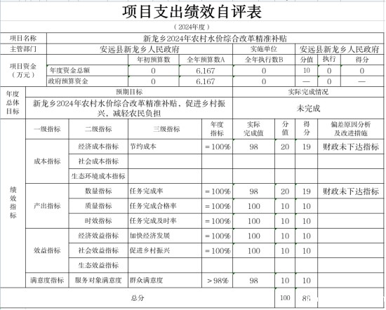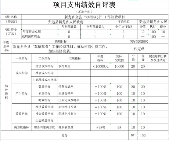 2024年,新龙乡积极推进预算绩效管理工作,不断提高预算绩效管理工作质量和水平。从自评情况来看,新龙乡预算编制合理,支出高效规范,及确保了机关正常运转,又保证了重点项目开支,财政支出绩效良好,自查自评结果为优秀,综合考核自评得分97分。
