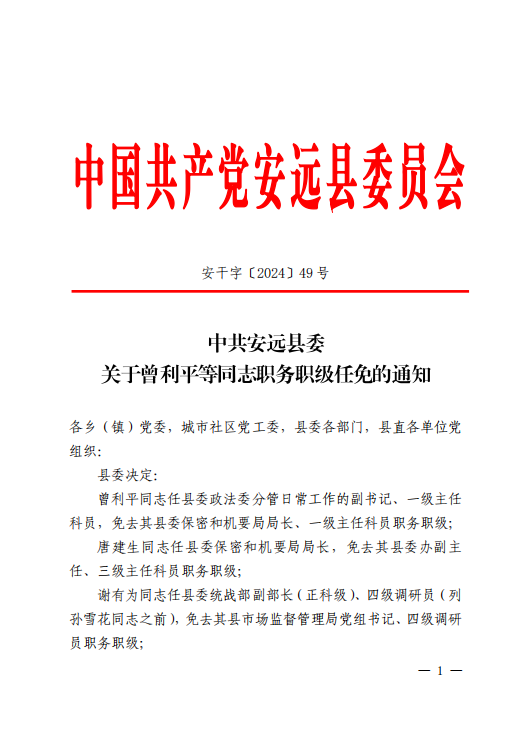 中共安远县委关于曾利平等同志职务职级任免的通知