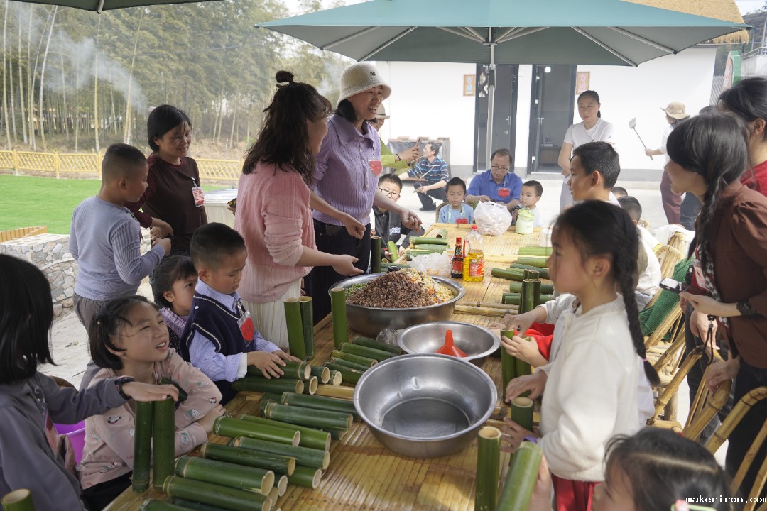 在竹博园的共享厨房中,孩子们在老师的带领下,先将香肠、香菇、雪豆等食材拌入香米中,随后一起填进竹筒,送入蒸柜中,一顿忙碌过后,一筒筒香喷喷的竹筒饭就出炉啦,空气中都弥漫着竹子的清香。