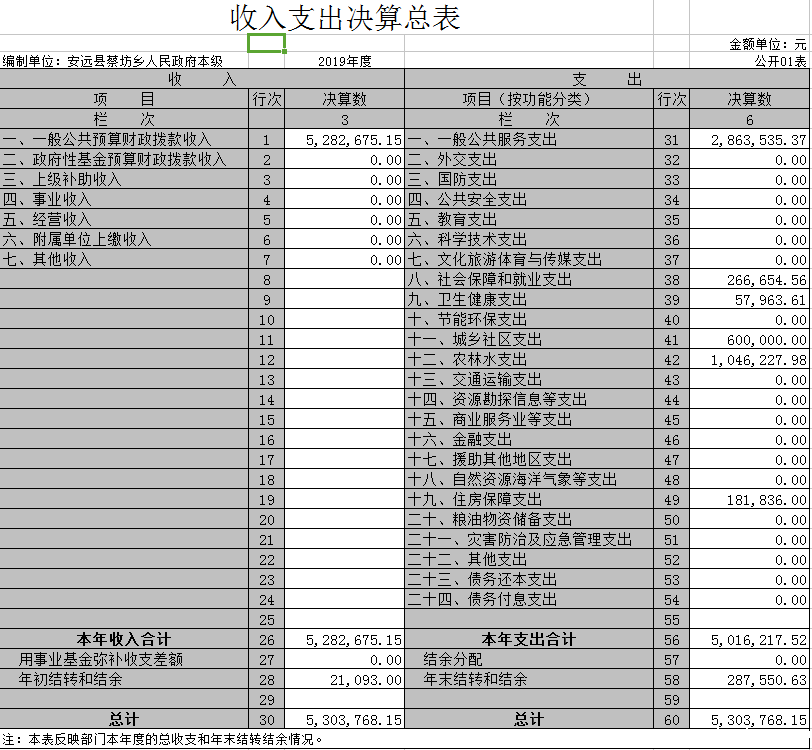 纳入本套部门决算汇编范围的单位共 1 个,(蔡坊乡人民政府)截止2019年底,编制数35个,其中:行政编制数18个、全额事业编制数17个;实有人数29人,其中:在职人数29人,包括行政人员14人、全额事业人员15人。