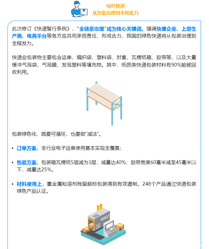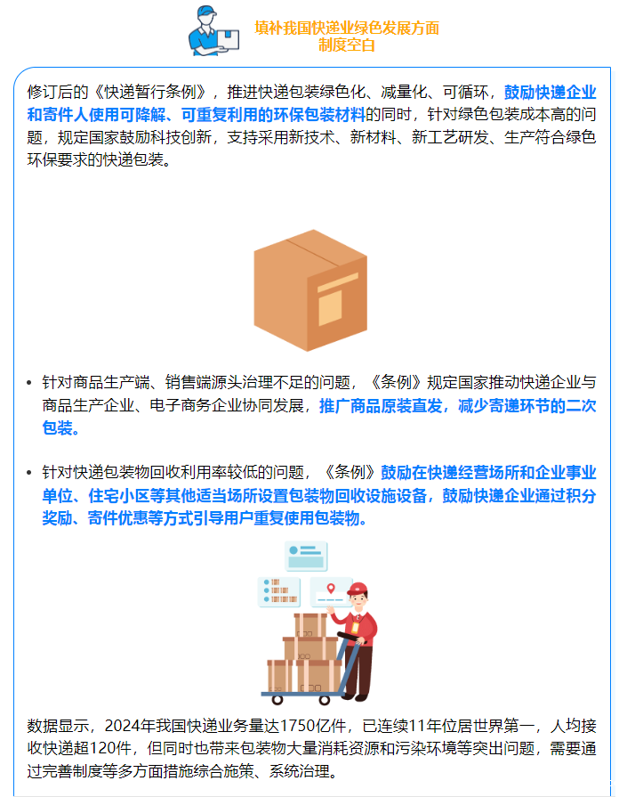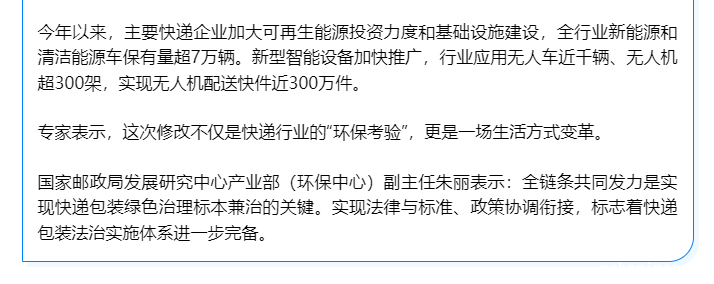 “国家鼓励经营快递业务的企业和寄件人使用可降解、可重复利用的环保包装材料。”
