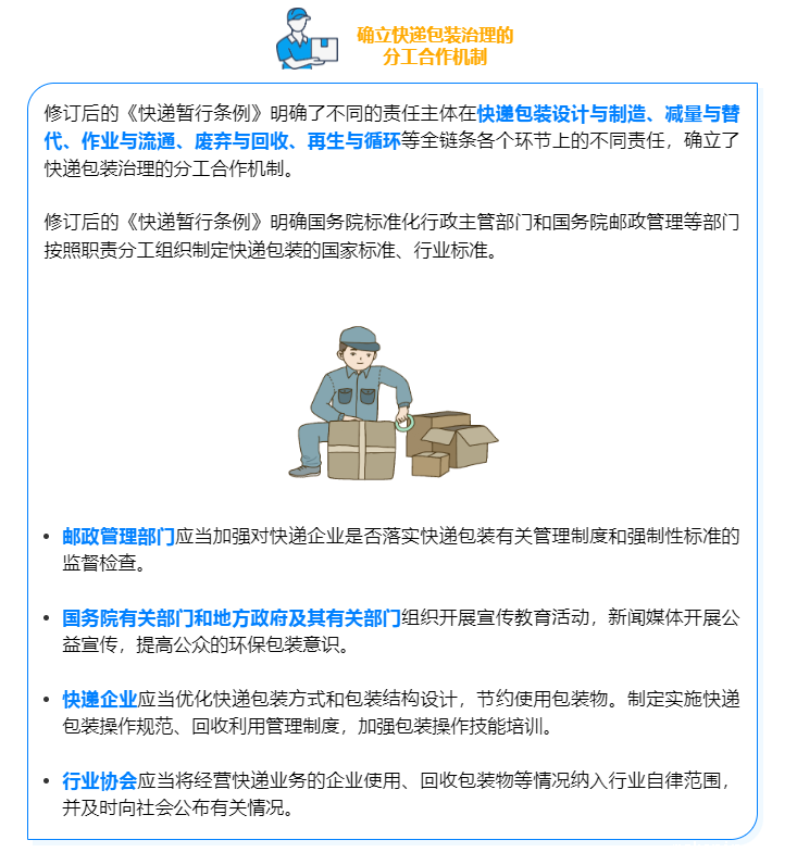 “国务院标准化行政主管部门和国务院邮政管理等部门按照职责分工组织制定快递包装的国家标准、行业标准。快递包装应当符合强制性国家标准。”