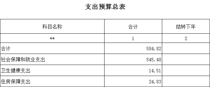 按支出功能科目划分:社会保障和就业支出545.48万元,较上年预算安排增加 99.41 万元,卫生健康支出14.51万元,较上年预算安排增加 3.34 万元,住房保障支出24.83万元,较上年预算安排增加 5.85 万元