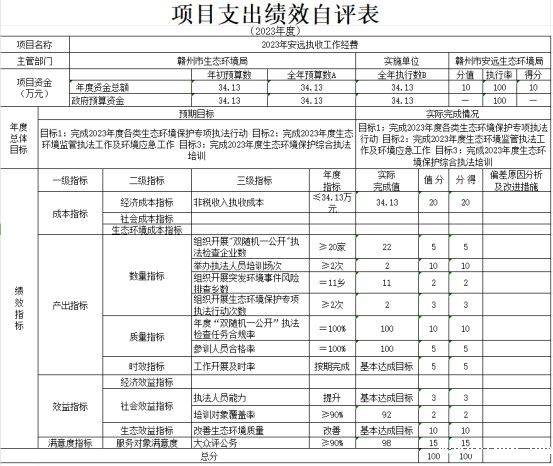 本单位“2023年安远生态环境监测执法经费项目支出绩效自评表”如下: