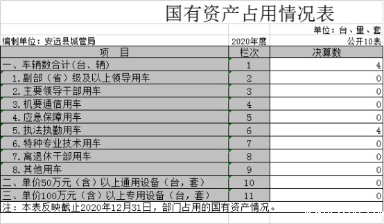 截止2020年12月31日,本部门(单位)国有资产占用情况见公开10表《国有资产占用情况表》。其中车辆中的其他用车主要是特种用殊车辆。