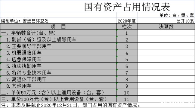 截止2020年12月31日,本部门(单位)国有资产占用情况见公开10表《国有资产占用情况表》。本单位只有环卫作业车辆,无其他种类车辆。