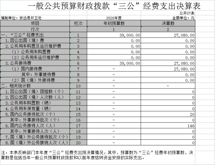 本部门2020年度一般公共预算财政拨款“三公”经费支出年初预算数为3.9万元,决算数为2.7万元,完成预算的69.23%,决算数较2019年(减少)0.8万元,下降29.63%,其中: