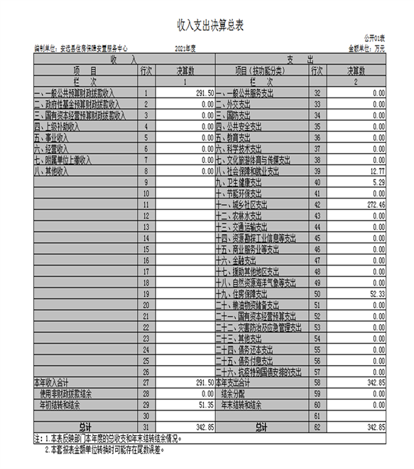 本单位2021年度收入总计 342.85 万元,其中年初结转和结余51.35万元,较2020年增加290.61万元,增长5.563 %;本年收入合计291.5万元,较2020年增加239.26万元,增长4.58%,主要原因是:县住房保障安置服务中心于2021年4月顺利组建,期间为住建局代管。2021年11月住保中心班子到位履职,全力推动住保中心各项工作高质量发展。