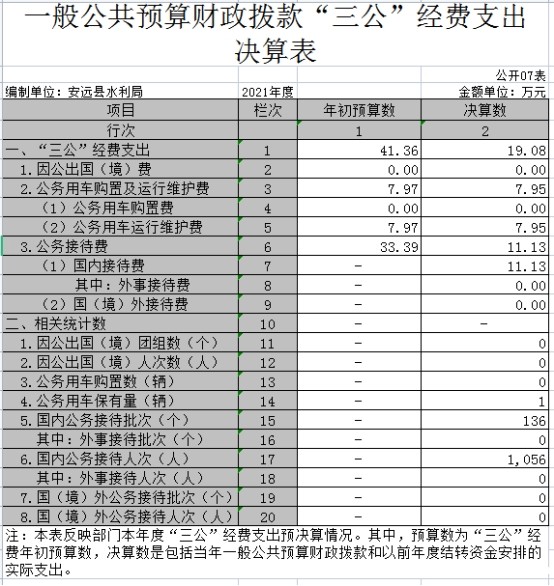 本部门2021年度一般公共预算财政拨款“三公”经费支出年初预算数为41.36万元,决算数为19.08万元,完成预算的100%,决算数较2020年减少1.08万元,下降5.36%,其中: