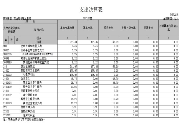 本单位2021年度支出总计251.44万元,其中本年支出合计 251.44万元,较2020年增加41.88万元,增长19.98%,主要原因是:公卫活动职能增加,相应地增加了支出;年末结转和结余 0万元,较2020年减少 0.1万元,下降100%,主要原因是:本年预算较精确,以支定收,加强资金使用的管理,严格按照财政及单位规定合理使用资金。