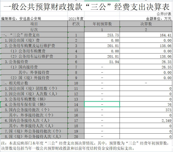 十六、“三公”经费:指各部门因公出国(境)费、公务用车购置及运行费和公务接待费。其中,因公出国(境)费指单位公务出国(境)的住宿费、旅费、伙食补助费、杂费、培训费等支出;公务用车购置及运行费指单位公务用车购置费及租用费、燃料费、维修费、过路过桥费、保险费、安全奖励费用等支出;公务接待费指单位按规定开支的各类公务接待(含外宾接待)支出。