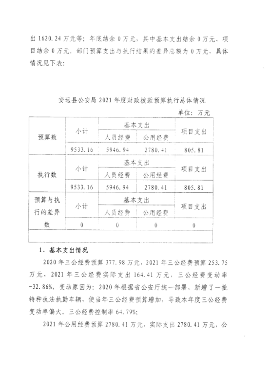 本部门2021年度支出总计9533.16万元,其中本年支出合计9533.16万元,较2020年增加308.22 万元,增长3.34 %,主要原因是:增加了交通管理大队、森林分局两个预算单位,增人增资;年末结转和结余0万元,较2020年减少226.7万元,下降 100 %,主要原因是:财政收回指标,调整了年末结转和结余数。