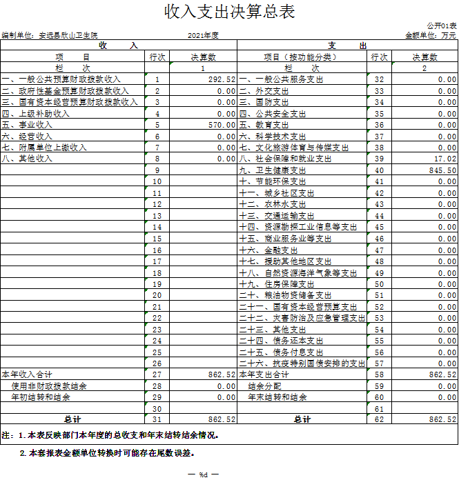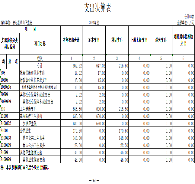 本单位2021年度支出总计 862.52 万元,其中本年支出合计 862.52 万元,较2020年增加275.24 万元,增长47.6 %,主要原因是:疾控中心接种门诊并入卫生院,收入增加支出相应增加;年末结转和结余 0 万元,较2020年增加0 万元,增长0%,主要原因是:本年预算较精确,以支定收,加强资金使用的管理,严格按照财政及单位规定合理使用资金。