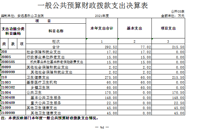 (二)卫生健康支出年初预算数为 253.67 万元,决算数为275.5 万元,完成年初预算的 100 %,主要原因是:财政拨款基本公卫及基本基药补助都按时按要求完成支付,本单位也圆满地完成了相应的任务。