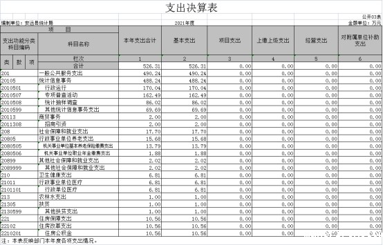 本部门2021年度支出总计526.31万元,其中本年支出合计526.31万元,较2020年减少535.39万元,下降49.14%,主要原因是:2020年统计局牵头开展第七次全国人口普查、全国脱贫攻坚普查,2021年无相关普查,所以支出有所下降;年末结转和结余0万元,较2020年减少27.8万元,下降100%,主要原因是:本年支出按预算进行,经费使用完毕,无结余。
