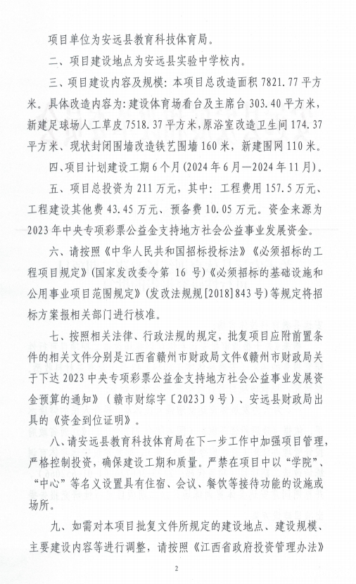 关于安远县体育训练场改造二期项目可行性研究报告的批复