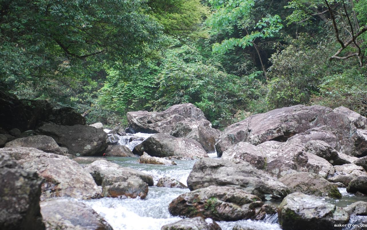 金龟饮泉 河滩上有三个形如神龟的巨石,浮于水面,相互追逐、戏耍,神形兼备,惟妙惟肖。