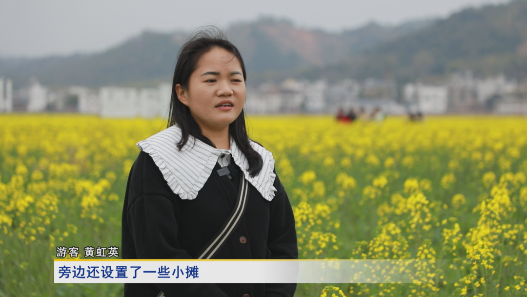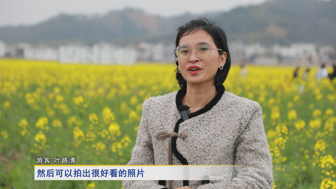 采访游客龙彩娇:这里的景色真的特别美,特别是那一大片油菜花,很出片,非常喜欢这里,刚好这边又有个民宿,我跟朋友们就决定在这里度过一个愉快的周末,好好放松一下。