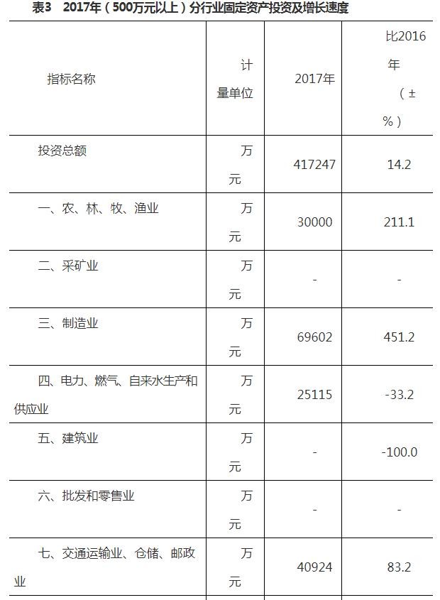 全年完成500万元以上固定资产投资417247万元,同比增长14.2%。其中工业固定资产投资完成94717万元,同比增长88.7%。