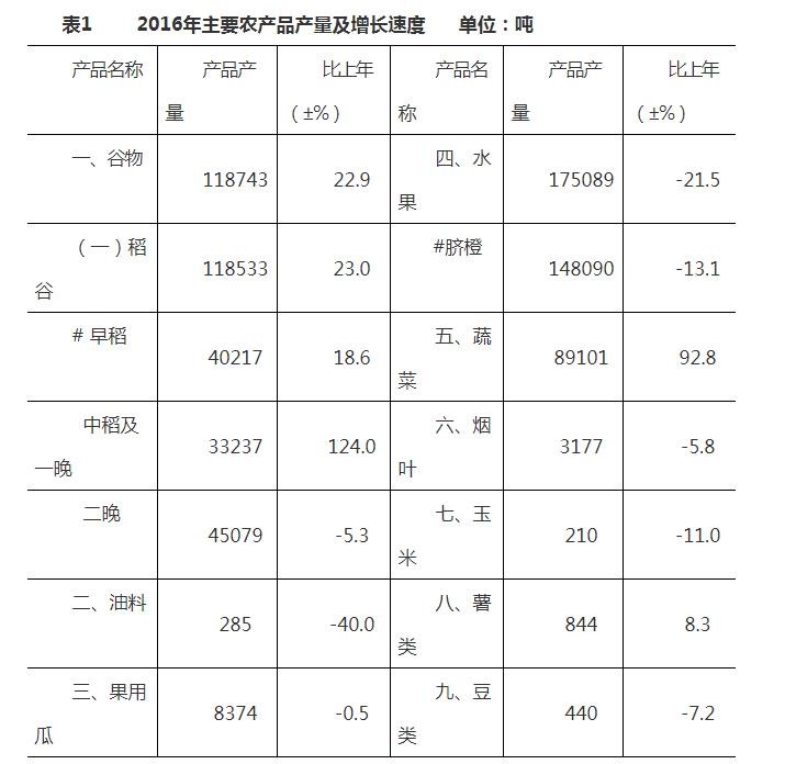 粮食生产稳步增长。全年实现谷物总产量118743吨,同比增长22.9%。其中早稻产量40217吨,同比增长18.6%;中稻及一晚33237吨,同比增长124%;二晚45079吨,同比下降5.3%。全年果用瓜产量8374吨,同比下降0.5%;烟叶产量3177吨,同比下降5.8%;蔬菜产量89101吨,同比增92.8%。