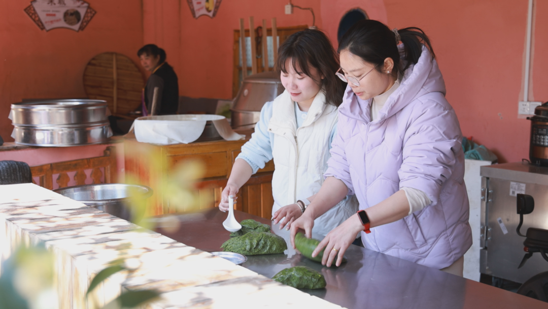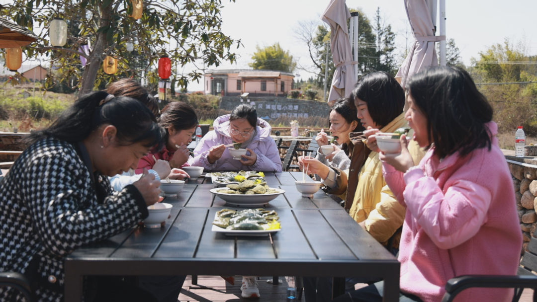 采访游客李燕∶每到清明节的时候,我们当地都有做艾叶粄的习惯,采摘到新鲜的艾叶包上各种口味的馅,比如有香菇的,还有韭菜的,酸菜的,再拿去蒸、炸、煎,特别的美味。